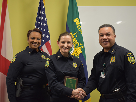 New Deputy Chief Amy Schreiner (center) with Chief Daryl Green, Ph.D. (right) and Deputy Chief Zandral Washington (left) at the promotion ceremony.The UAB Police and Public Safety Department held its first promotional ceremony on Jan. 3, 2024, recognizing officers and employees who have moved up the ranks for their dedication and committed service to the UAB Community.
