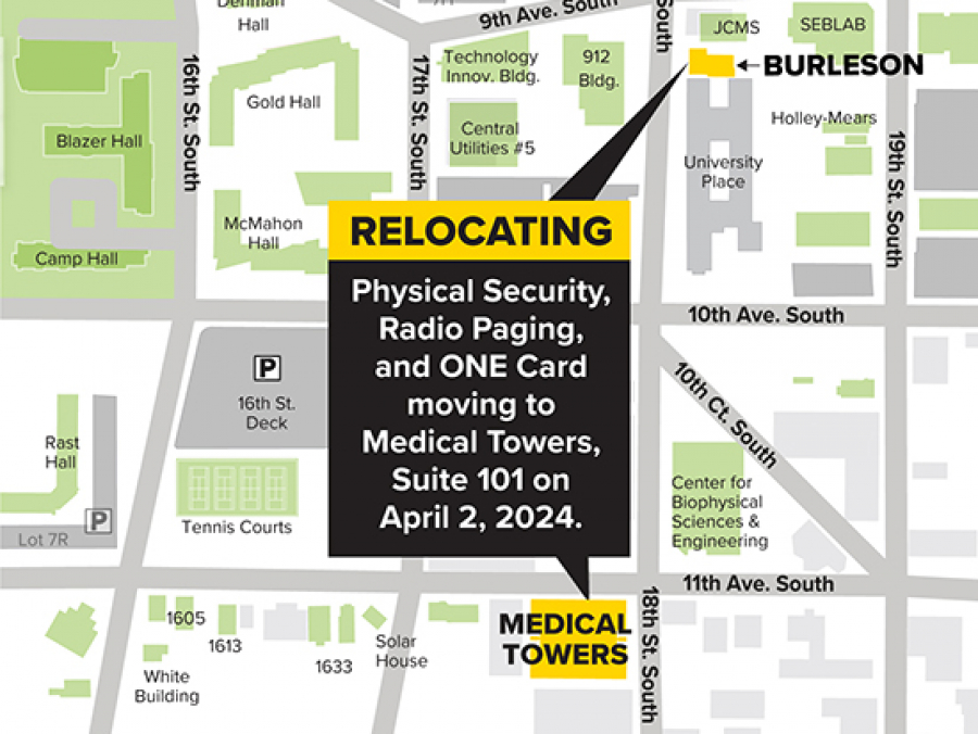 The Physical Security, Radio Paging and ONE Card offices moved from the Burleson Building to new space in Medical Towers on April 1 and are now open in their new location, Suite 101 on the first floor of Medical Towers.