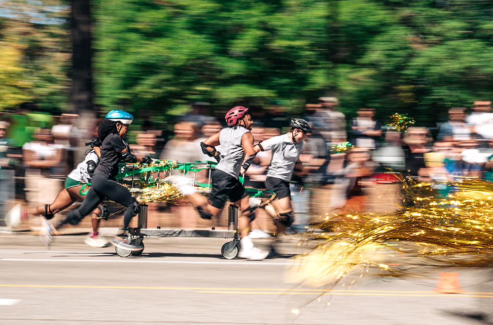 "It was my third experience photographing the annual Gurney Derby and it just keeps getting better. I think this panning shot is a fun example of the level of intensity during the races. (Panning creates a crisp image of the subject(s) while blurring the background.) Even though the racers are the main attraction, the gold streamers glistening in the sunlight in the foreground really get my attention!"— Jennifer Alsabrook-Turner, university photographer