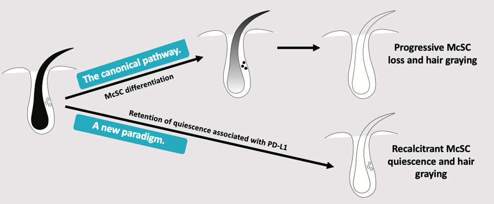 The research has convinced Harris that a new paradigm is at play. The canonical pathway — progressive melanocyte stem cell loss and hair graying — making way for a new paradigm of recalcitrant melanocyte stem cell quiescence and hair graying. “This suggests we can find therapies to reactivate them,” Harris said. The compound she is investigating with the biotech startup could be a promising way forward.