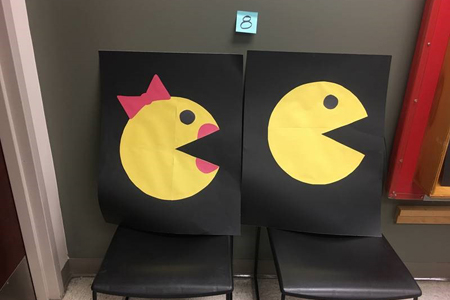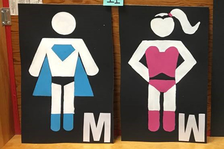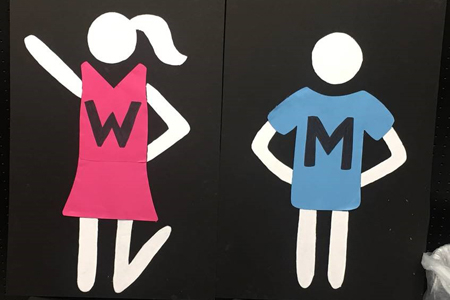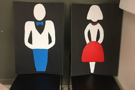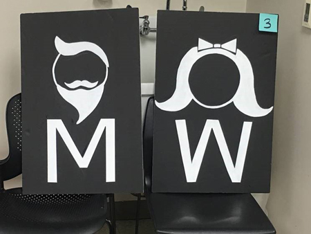 The UAB occupational therapy students designed their restroom signs with concepts of print visibility including large print, high contrast, block letters with gender specific looks and colors.