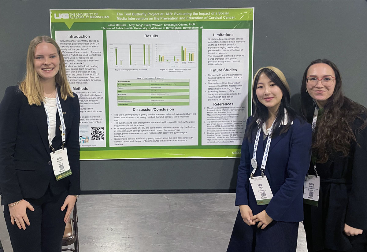 Pictured left to right: Public Health students Josie McGuire, Amy Yang and Haley Weaver present their research at APHA 2023.The purpose of this award is to allow UAB students working with HPO faculty to attend a domestic or international conference as a presenter of a poster/presentation.
