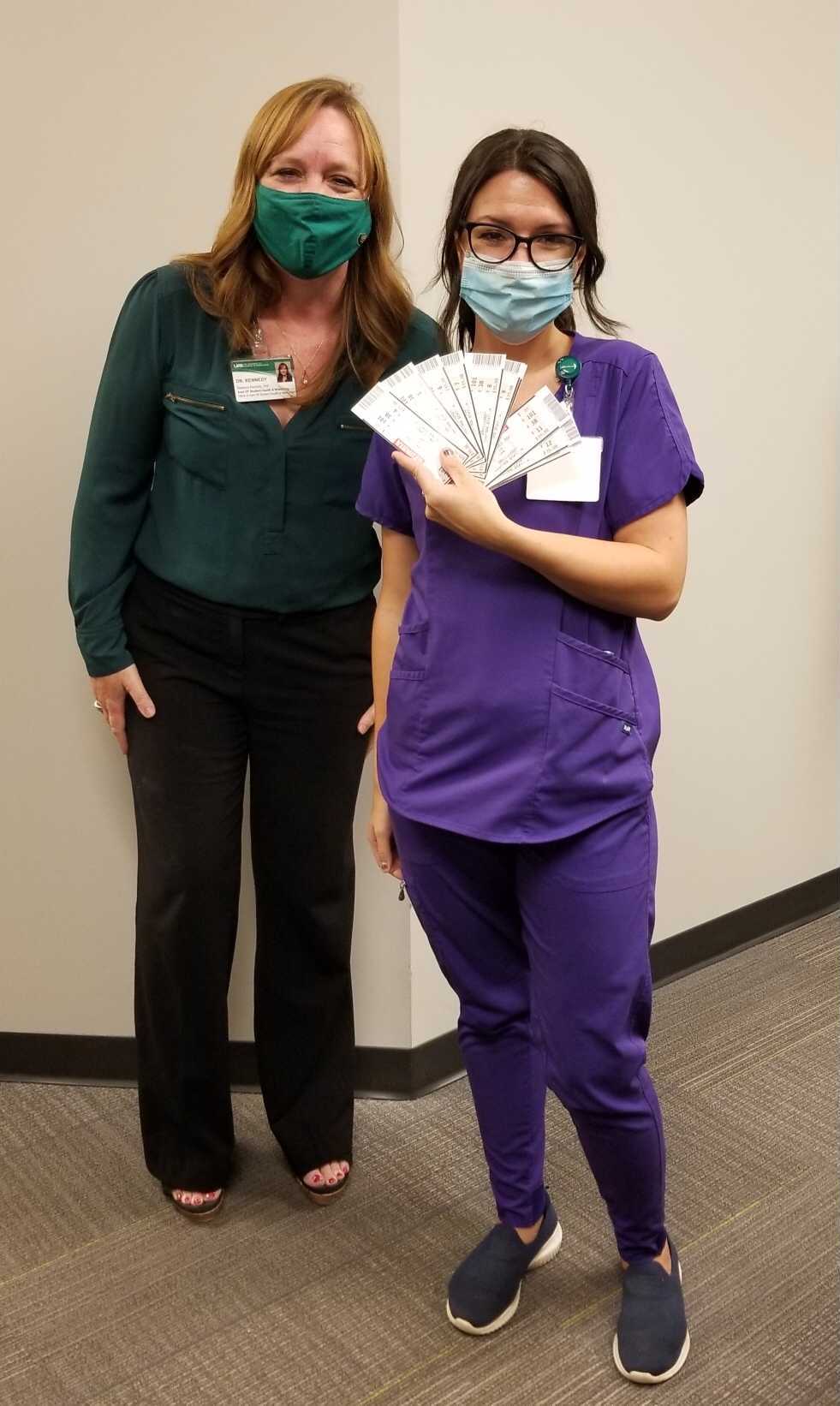 Student Pamela Hayes receives 10 tickets to the UAB vs. Georgia football game Sept.8, 2021; Assistant Vice President Dr. Rebecca Kennedy stands at Pamela's side