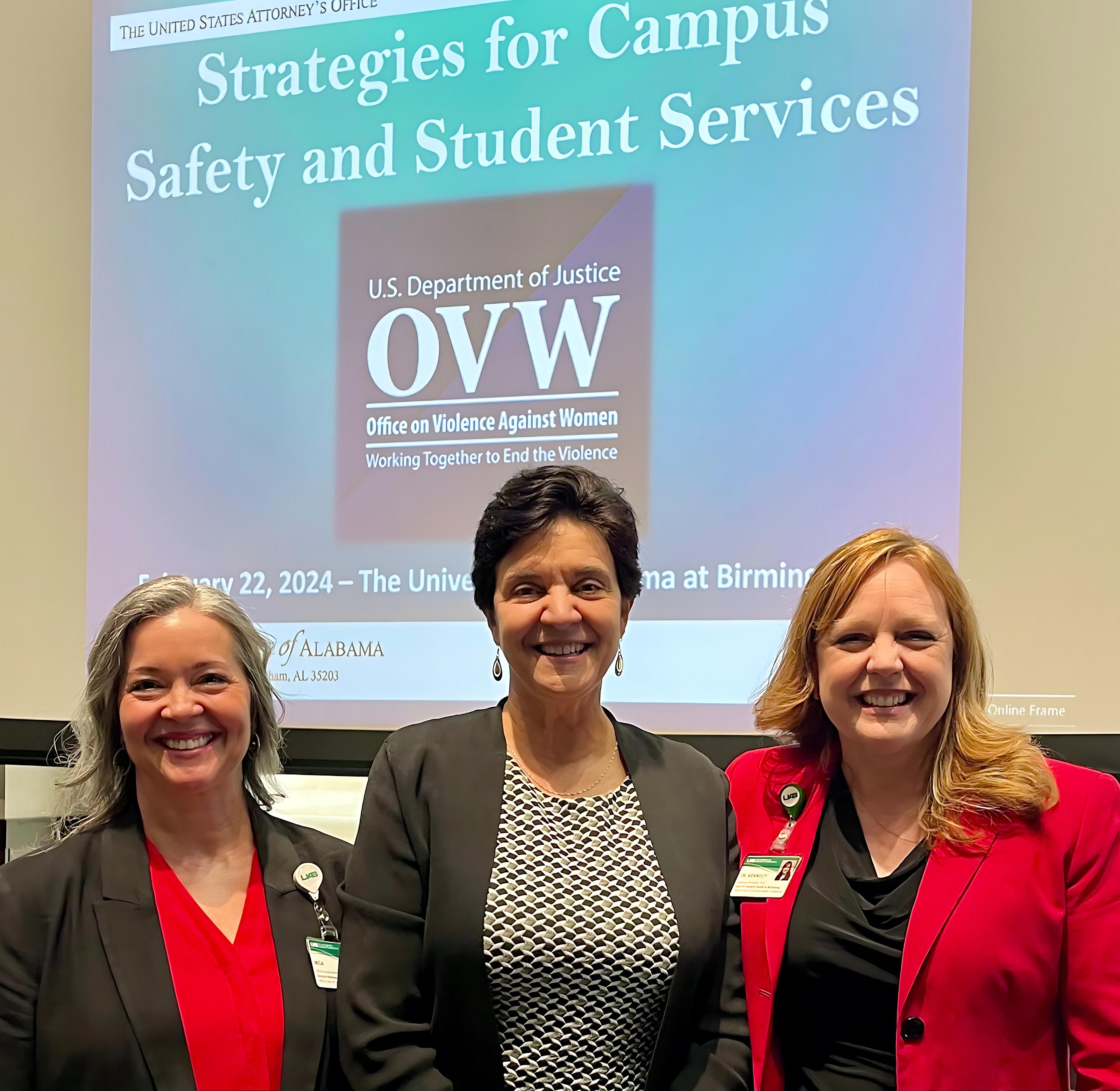 L-R: Mica Harrell, Director, UAB Wellness Promotion, Rosie Hildalgo, Director, OVW, and Rebecca Kennedy, Ph.D., UAB AVP, Student Health & Wellbeing