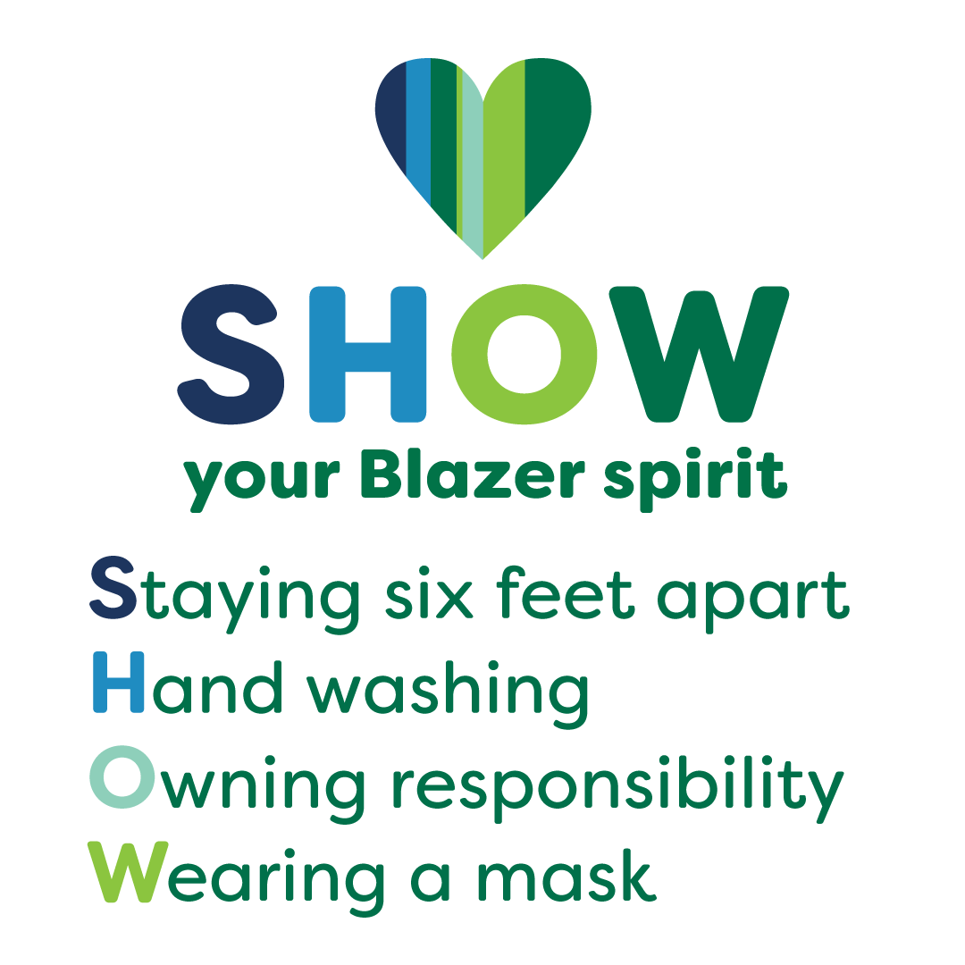 As we’re sure you remember, SHOW stands for Staying six feet apart, Hand washing, Owning responsibility and Wearing a mask. When you are adopting these safety measures, you are SHOWing your Blazer spirit by protecting your fellow students and helping to make UAB a safer place.
