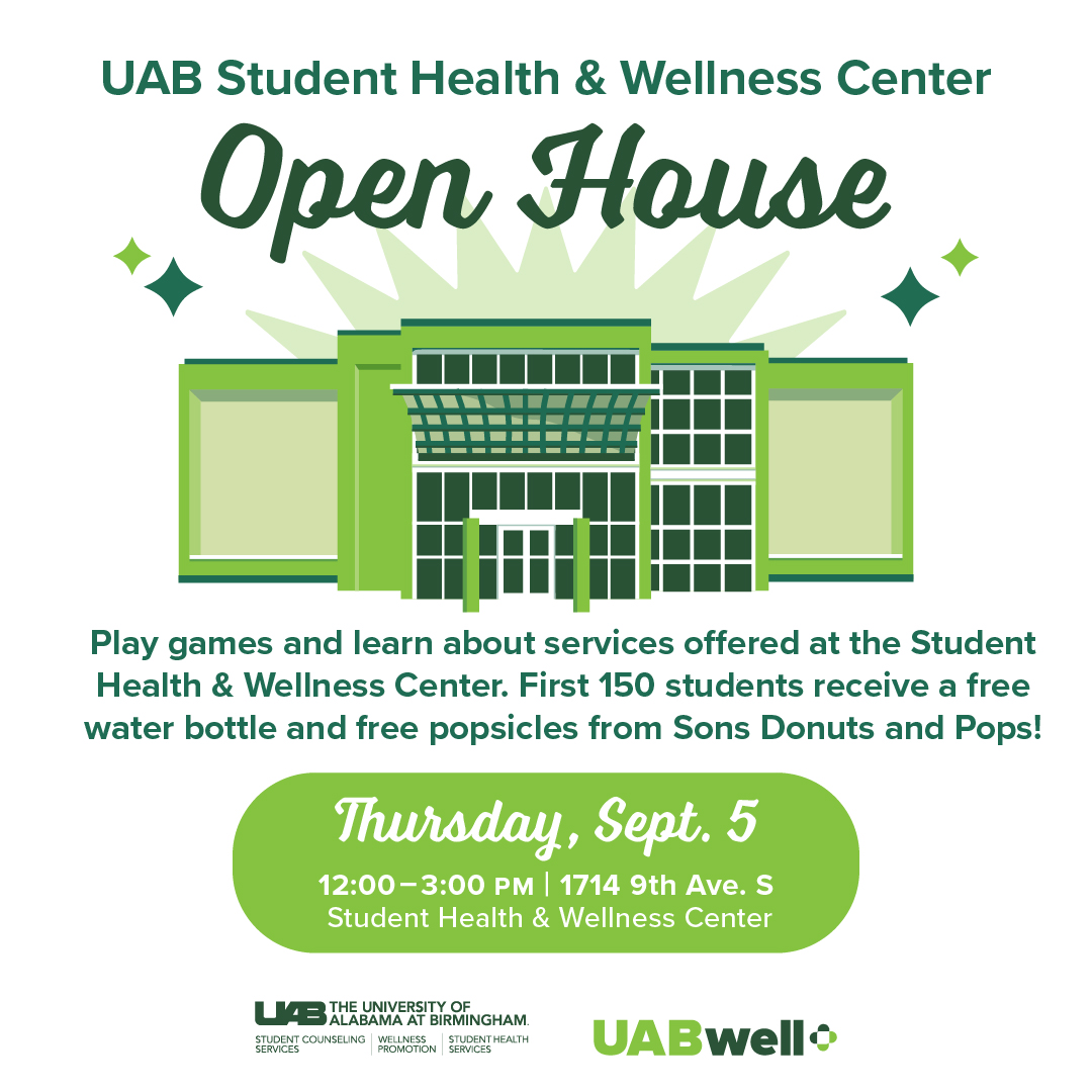Come learn about the many services housed at the UAB Student Health & Wellness Center on Thursday, September 5 from 12 p.m. to 3 p.m.