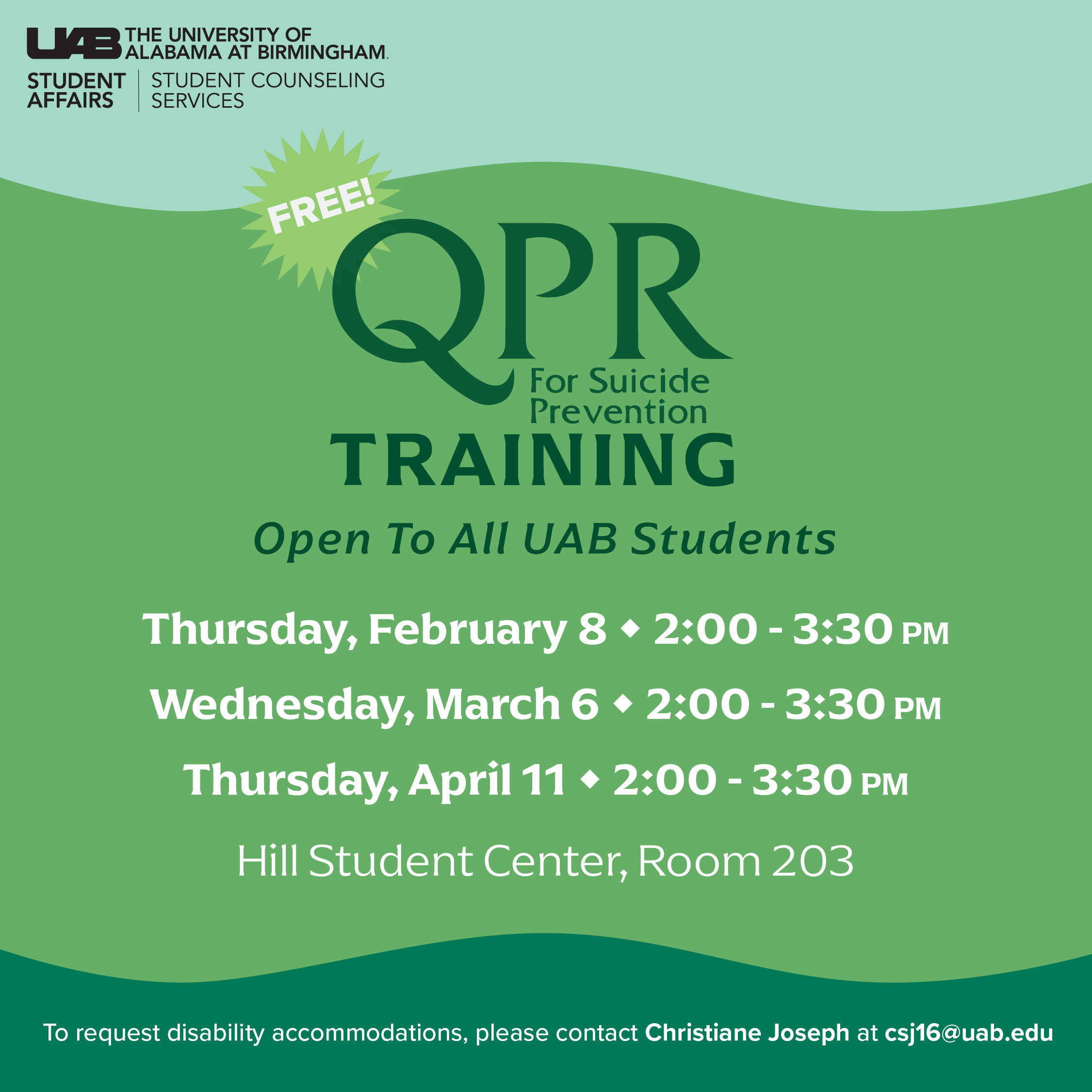UAB Student Counseling Services (SCS) is here to offer Question, Persuade, and Refer (QPR) training that aims to teach a person how to recognize and assist someone experiencing a mental health crisis.