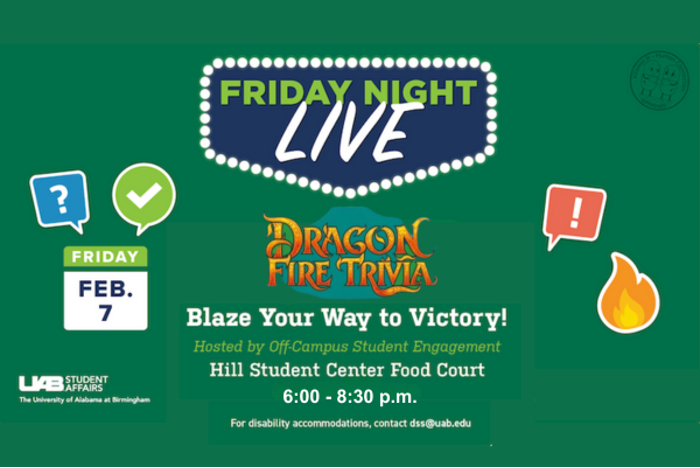 All UAB Blazers are invited to team up for a fun and competitive trivia night during Dragon Fire Trivia Night at the Hill Student Center on Friday, February 7.As part of the UAB Division of Student Affairs' Friday Night Live series, Dragon Fire Trivia Night will last from 6 - 8:30 p.m. on the first floor of the Hill Student Center.