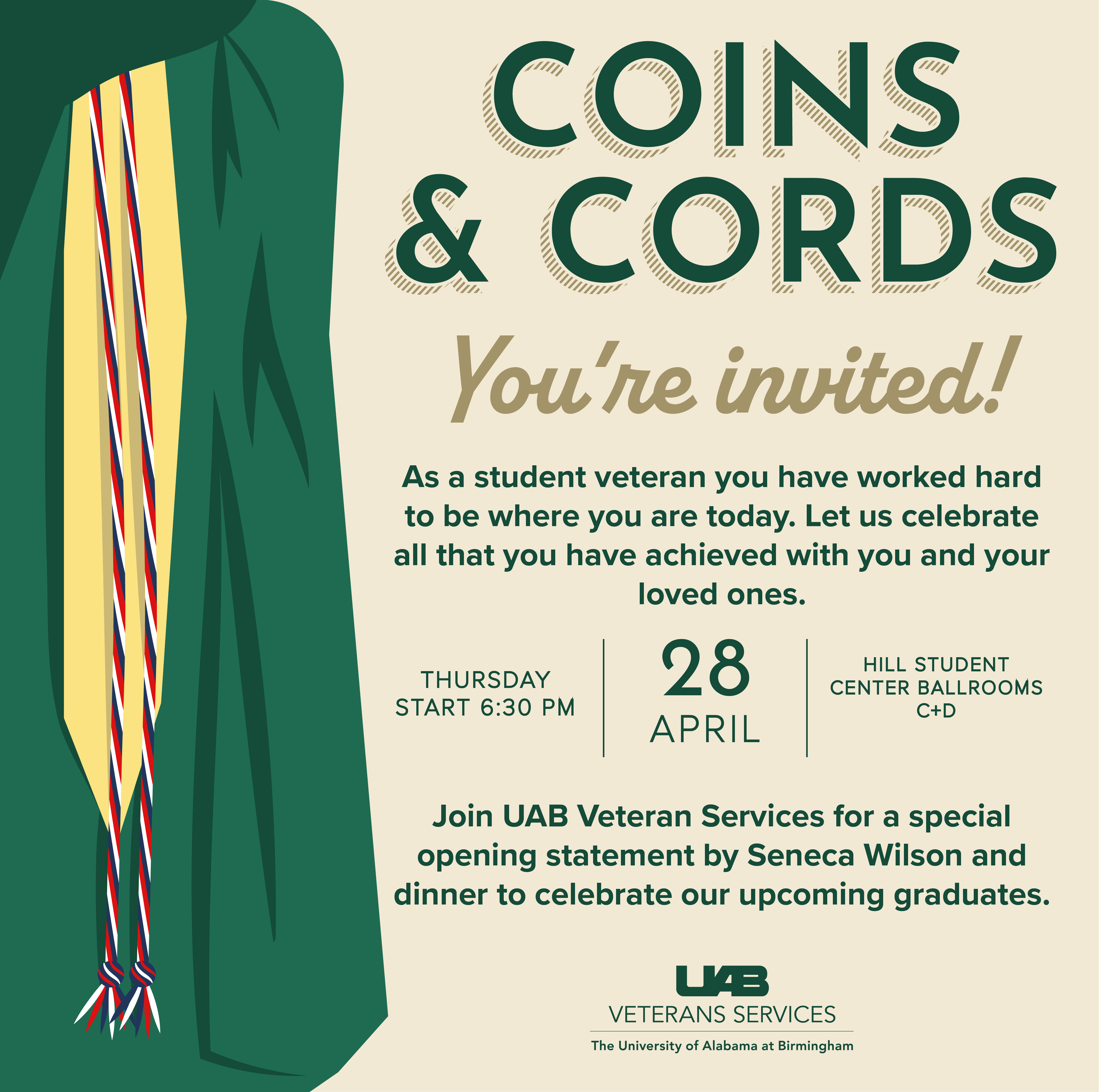 UAB Veterans Services is delighted to honor the academic achievements of student veterans and active service members at the Veterans Services Graduation Cord and Challenge Coin Ceremony on Thursday, April 28 at 6:30 p.m.