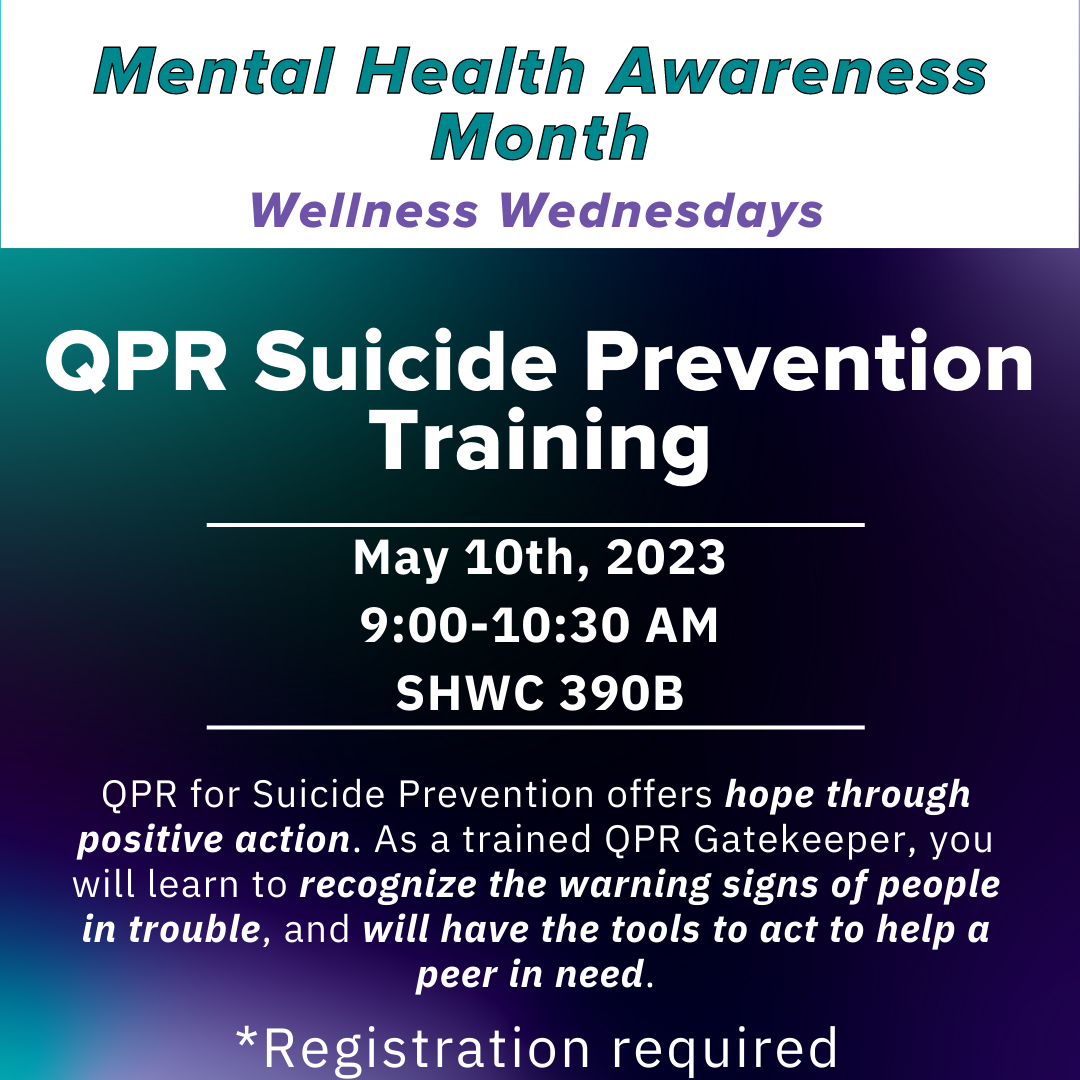 Question, Persuade, Refer framework and training offers hope through positive action. As a trained QPR Gatekeeper, you will learn to recognize the warning signs of people in trouble, and will have the tools to act vigorously to help. Registration required:Click to RegisterOpens an external link.