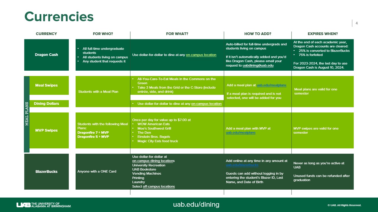 Meals are exclusive to the meal plan holder aside from designated guest passes. Dragonfire and Gold Block plan holders may use up to fifteen (15) meals per semester for dining guests. Green & Gold plan holders may use one of their meals each week for dining guests. Dining Dollars may be used for guests at any time in any UAB Campus Dining location.