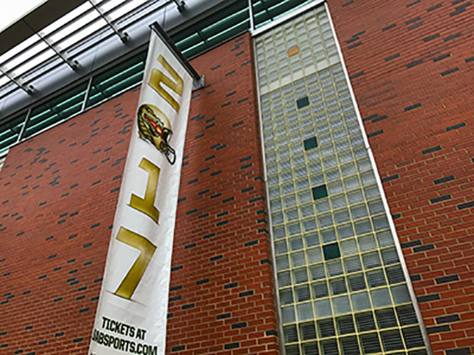 - UAB Pedestrian Light Poles: Size of banners on light poles is 18” wide by 36” tall, including 2” sewn pole pocket at both the top and bottom of the banner height. Note: Sizes may vary depending on pole types.