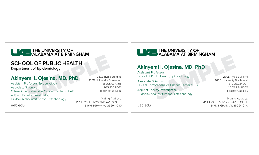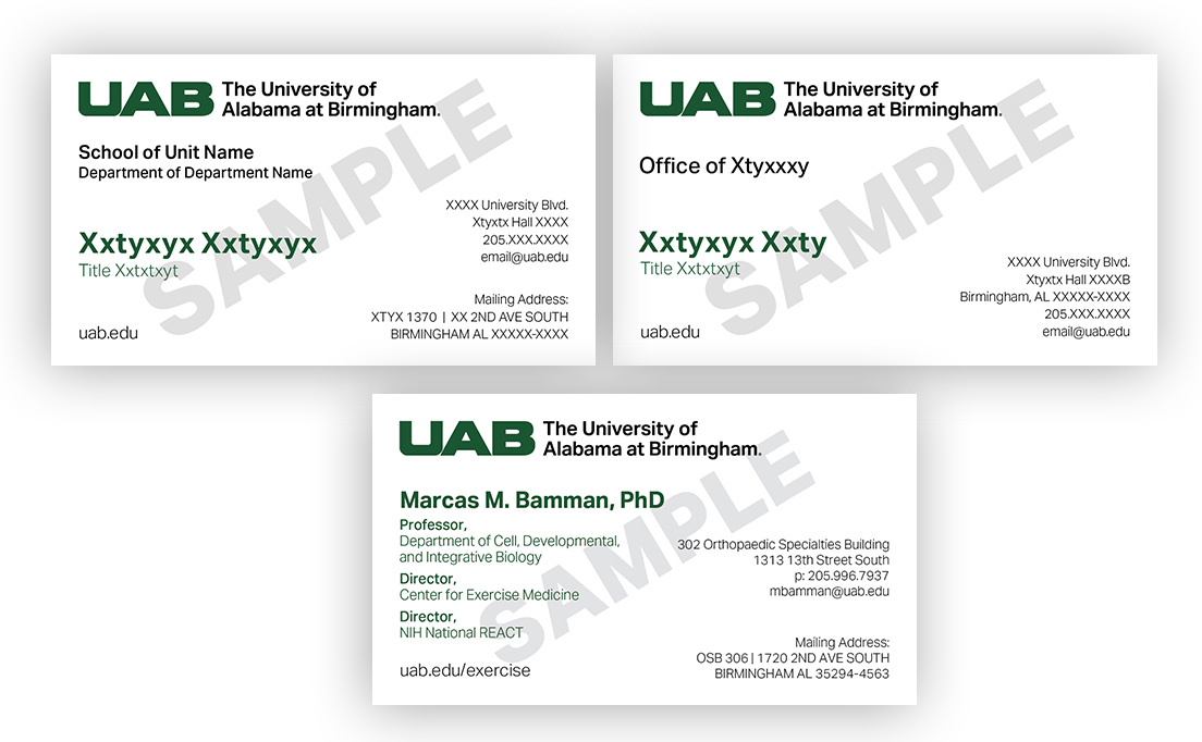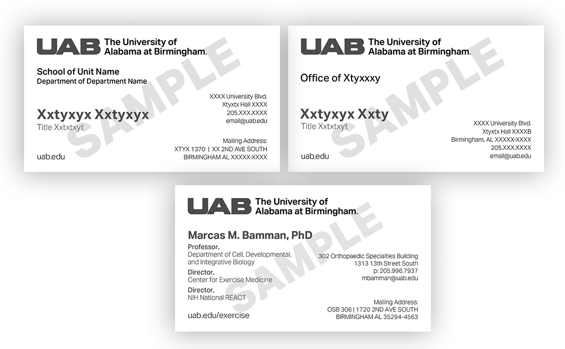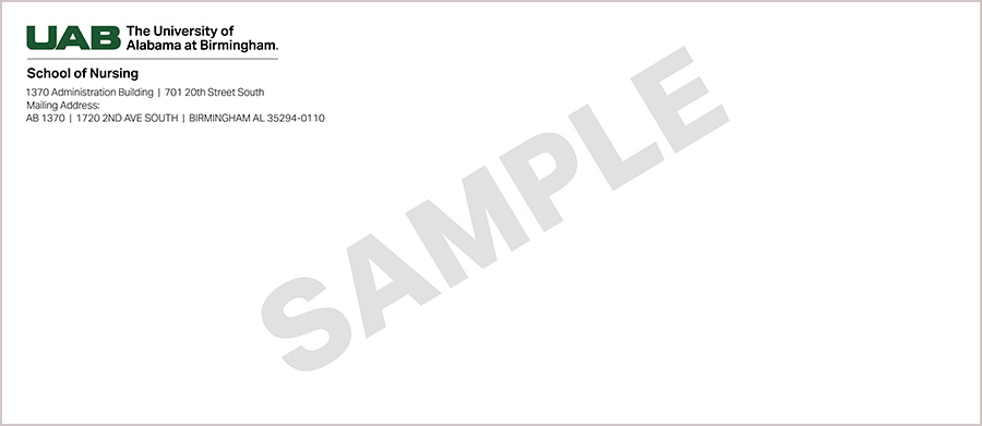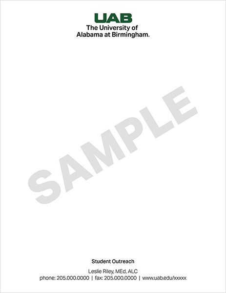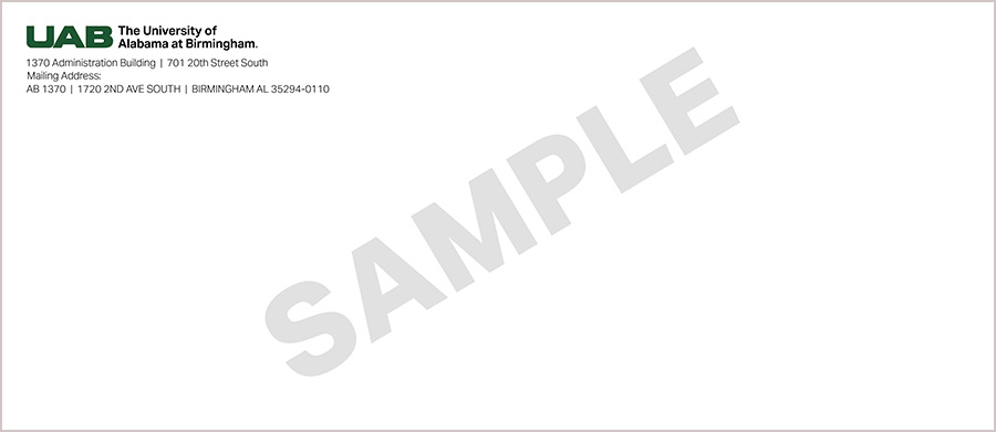 To grow UAB's brand awareness and ensure consistency, UAB Printing & Mailing Services prints all UAB stationery from approved templates designed by the Office of Marketing and Communications. Using an outside vendor to re-produce UAB stationery is unauthorized and could result in trademark infringement and/or declined payment from University Purchasing.