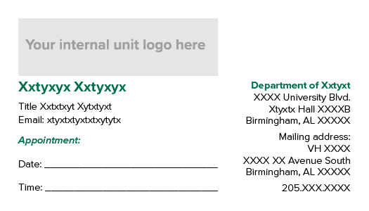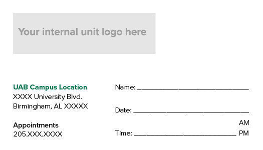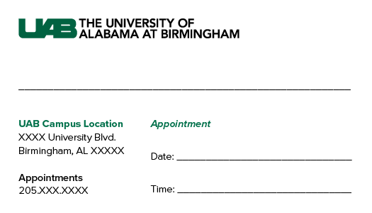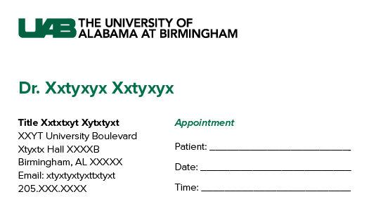 To accommodate the various campus units that utilize patient / appointment cards, we offer the below templates that feature your unit logo (instead of the core university logo). To order campus patient / appointment cards, contact UAB Printing and Mailing Services directly.