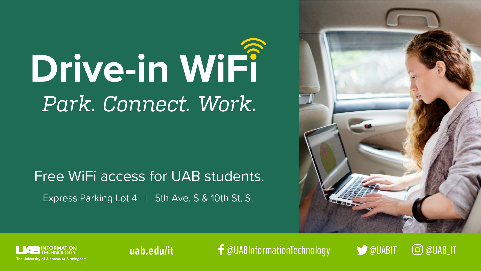 For UAB students who may not be able to use a secure WiFi network, UAB is opening a parking lot on campus to provide Drive-In WiFi.